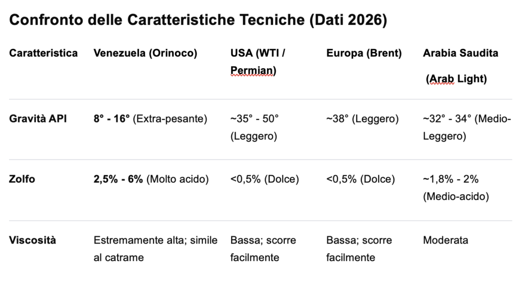 Sebbene il Venezuela detenga le riserve più vaste al mondo (oltre 303 miliardi di barili a gennaio 2026), la qualità del suo greggio presenta sfide tecniche ed economiche uniche. Riportiamo di seguito una tabella che riassume le principali caratteristiche del petrolio venezuelano e poi proviamo ad interpretarle senza indugiare troppo ovviamente sulle caratteristiche chimiche.