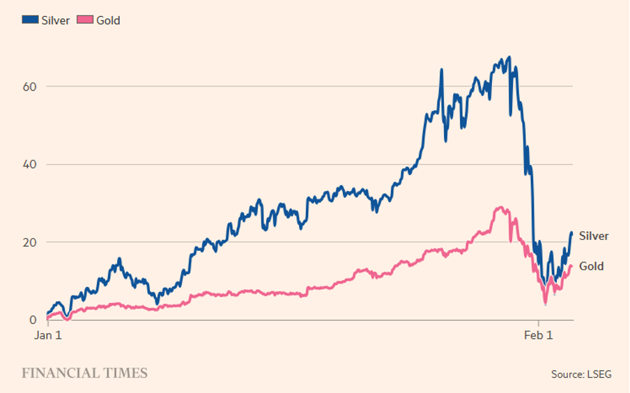 L’opinione più comune è che la detonazione sia partita dalla nomina di Kevin Warsh a presidente della Fed, interpretata come segnale di maggiore ortodossia monetaria e minore probabilità di tagli aggressivi dei tassi cui si sono aggiunti fattori tecnici quali l’aumento dei requisiti di margine su futures ed ETF (CME, borse USA e cinesi), le vendite stagionali pre–Capodanno lunare in Cina ed il rafforzamento marginale del dollaro.