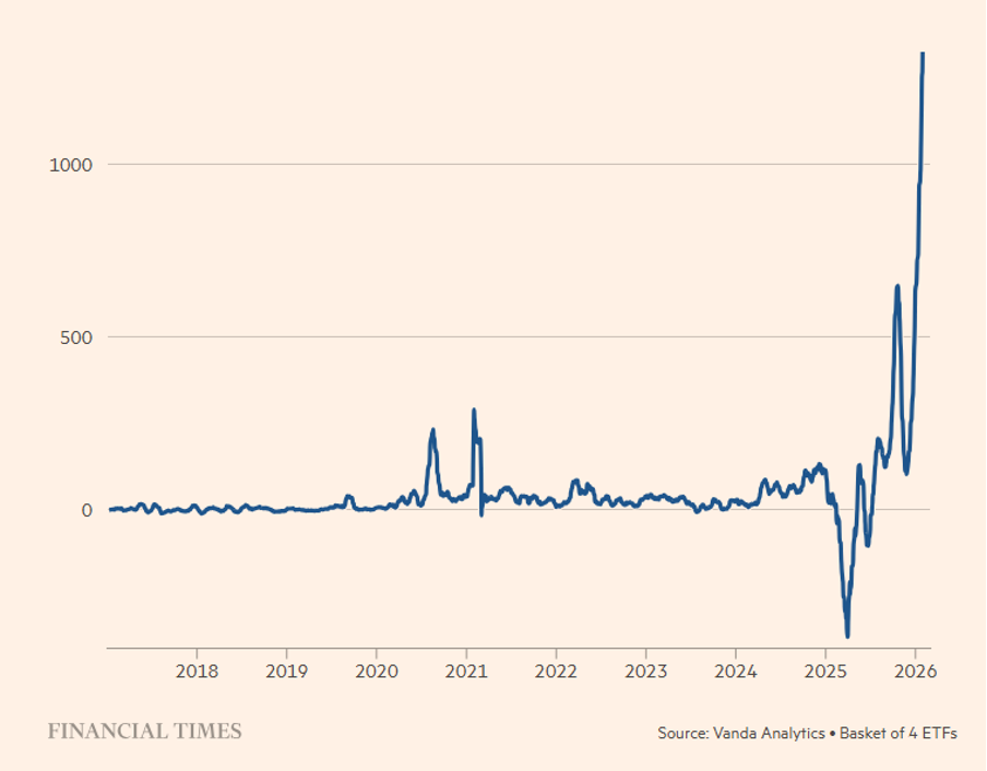 Figura 2. Acquisti netti al dettaglio di ETF sull’argento (dati in milioni di dollari). Ammontari su base mensile.