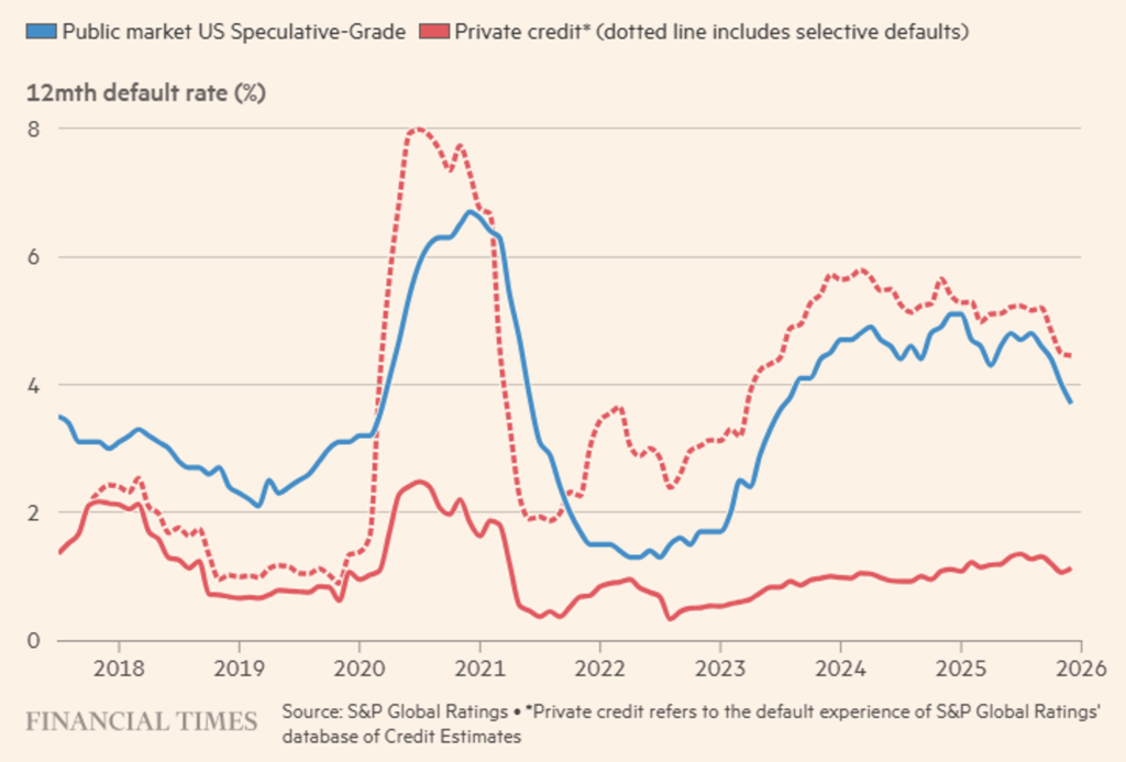 Uno dei motivi per cui il private credit è cresciuto così rapidamente è che sembra meno volatile del credito pubblico (ovvero quello quotato). Ma questa stabilità deriva spesso da valutazioni trimestrali prodotte con modelli interni e dall’assenza di contrattazione continua.