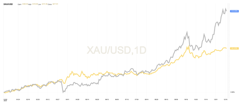 Figura 1. Comparación entre el rendimiento de la plata (línea gris, aproximadamente +113 %) y el del oro (línea amarilla, aproximadamente +60 %) para 2025.