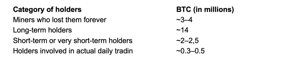 Тем не менее, давайте перестанем мечтать и посмотрим правде в глаза. Как мы знаем, предложение BTC будет ограничено чуть более чем 21 миллионом монет, и в настоящее время добыто чуть менее 20 миллионов. Как мы уже сказали, речь идет о покупке 5% рынка. К сожалению, рынок не состоит из 20 миллионов цифровых монет: их гораздо меньше, как показано в таблице ниже:
